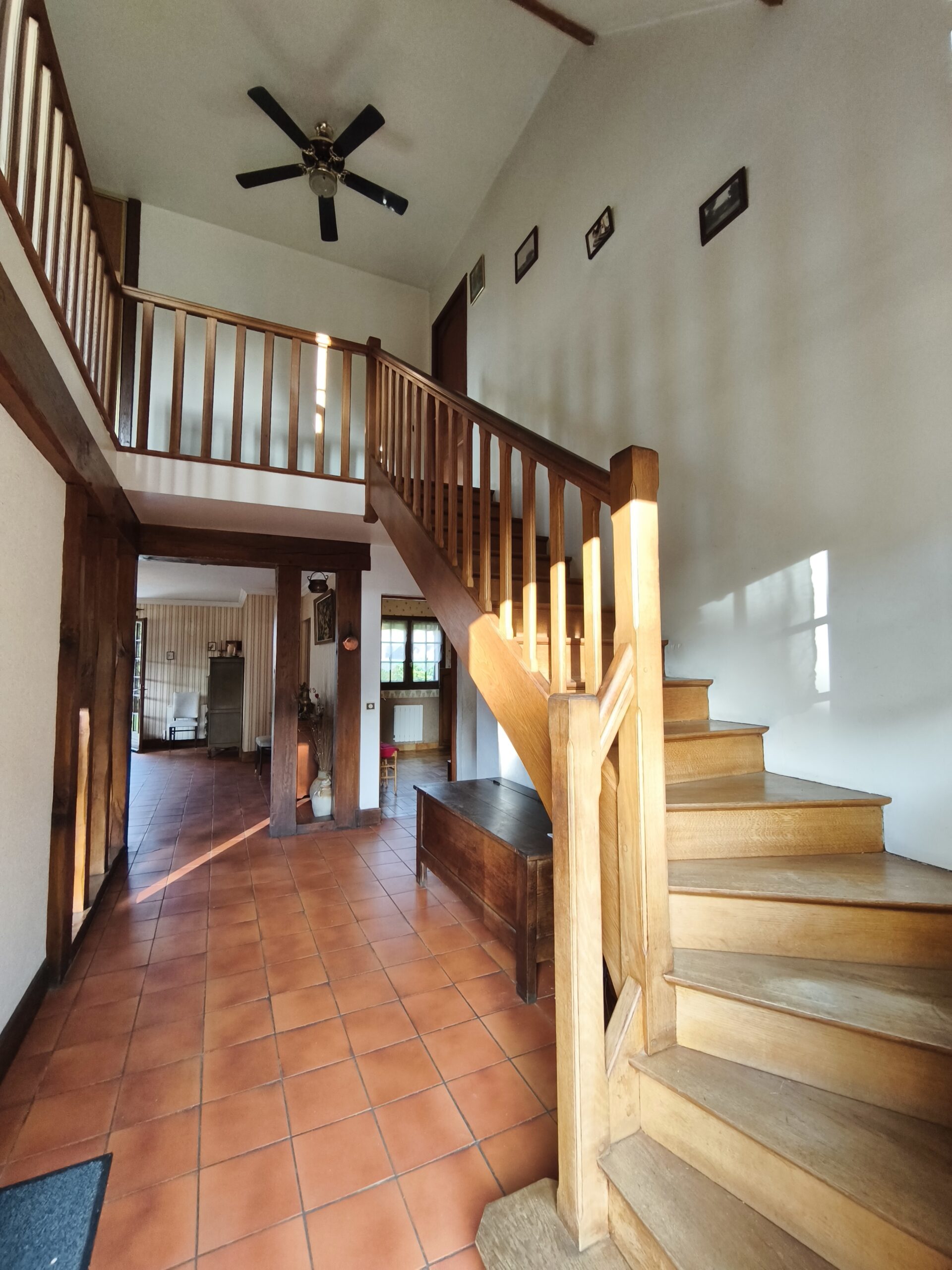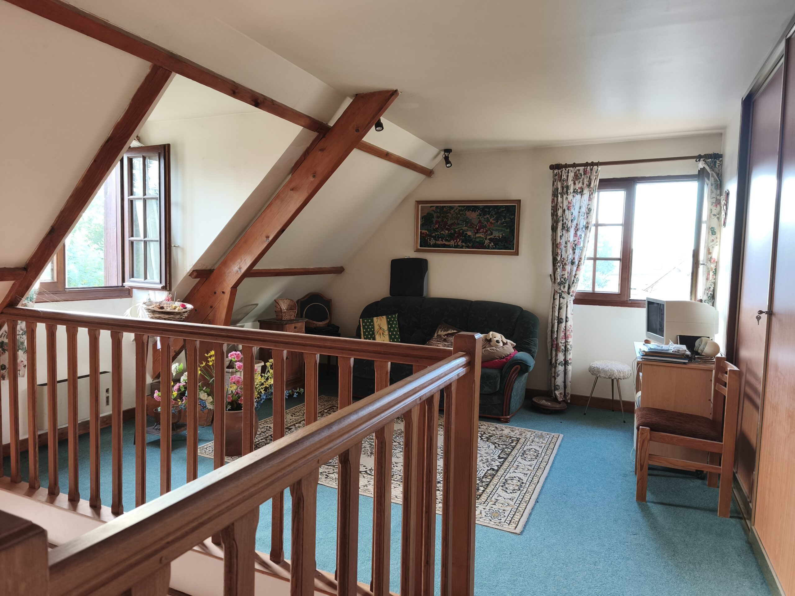 A l’étage, vous apprécierez un palier pouvant servir d’espace bureau, une seconde grande chambre avec dressing et une troisième chambre spacieuse avec des grands placards et un WC.